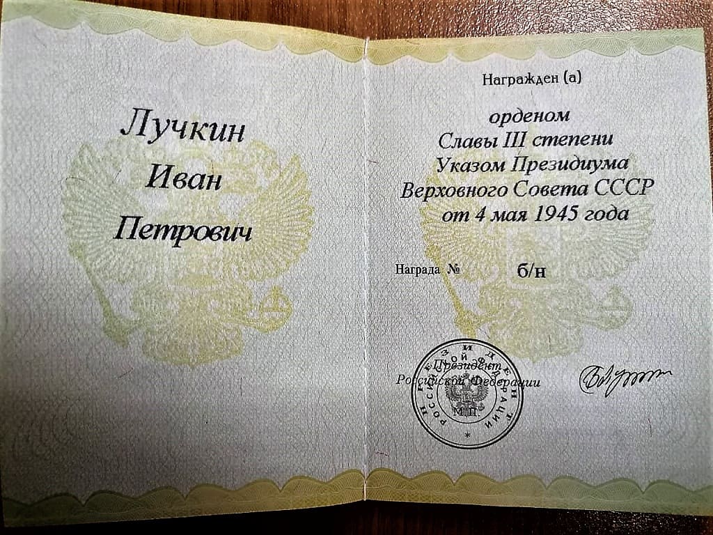 О том, что награда так и не была вручена, узнал внук и тезка фронтовика Иван Николаевич Лучкин. В прошлом году в электронной базе данных о награжденных, открытой Минобороны для всеобщего информирования, он нашел сведения о не врученном Ордене Славы и обратился с заявлением в органы военного управления.