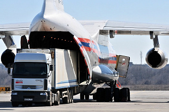 МЧС России продолжает доставку гуманитарных грузов в Ростов, где на базе Донского спасательного центра осуществляется формирование очередной автомобильной колонны МЧС России для отправки в Донбасс
