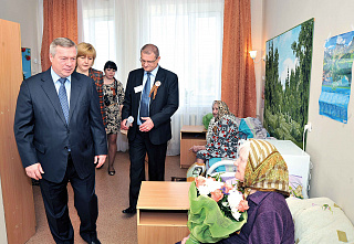 Очередная рабочая поездка главы донского региона Василия Голубева началась с поздравления и вручения подарков ветеранам Великой Отечественной войны, проживающим в доме-интернате для престарелых и инвалидов в хуторе Ленина Белокалитвинского района.
