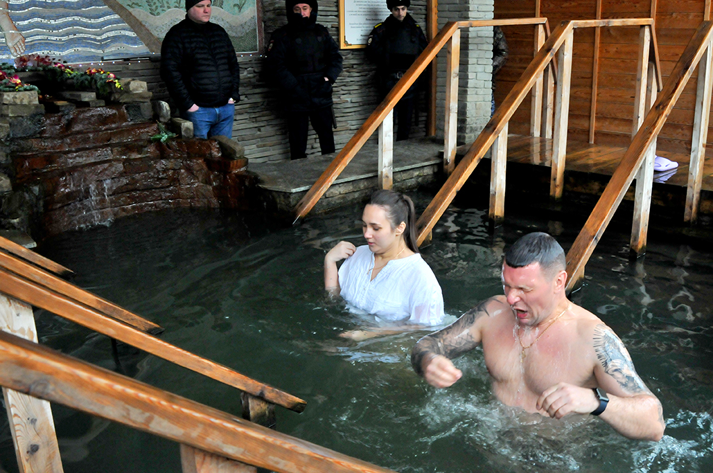 Для удобства верующих были установлены три армейские палатки с вешалками, где можно было обсохнуть и переодеться. В первой половине дня через крещенскую купель проходило около пятидесяти человек в час. Возраст желающих окунуться был самый разный – от подросткового до пенсионного. Температура воздуха составляла примерно восемь градусов Цельсия. Вода из источника была чуть теплее.