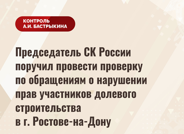 Председатель Следственного комитета Александр Бастрыкин поручил руководителю СУ СК России по Ростовской области Аслану Хуаде провести процессуальную проверку с учетом всех озвученных в публичном пространстве доводов и представить доклад о ее предварительных и окончательных результатах, а также о мерах по восстановлению жилищных прав дольщиков.