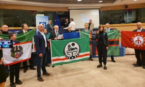 Развернув красный флаг с некими кабалистическими символами (на фото крайний справа), они поведали приятно изумленному европейскому собранию, что данный флаг будет иметь квазигосударственное образование, которое они называли «Ногайской республикой» И вот это фейковое государство и должно якобы будет принять под свои знамена Ростовскую область вместе с другими регионами Юга России. Правда, при этом не исключают варианта захвата Украиной Ростова и Таганрога.