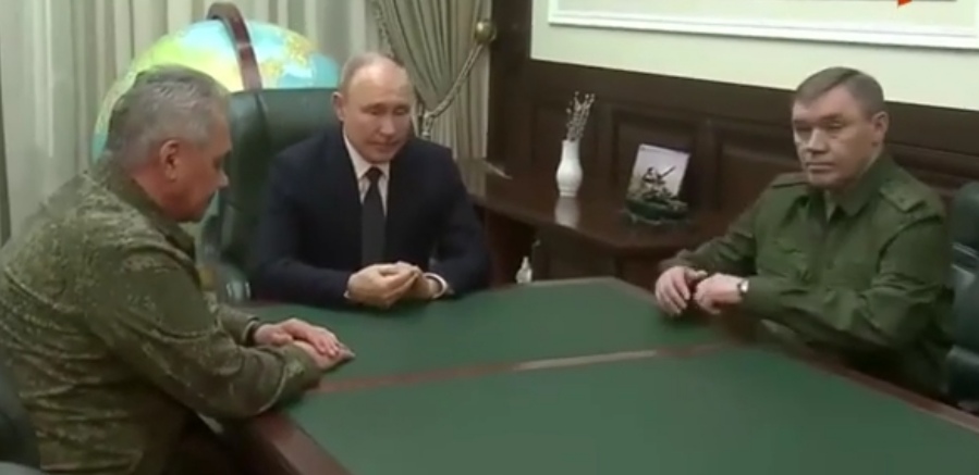 Верховного Главнокомандующего в штабе сопровождали министр обороны Сергей Шойгу, начальник Генерального штаба Вооруженных сил РФ Валерий Герасимов и другие военачальники.