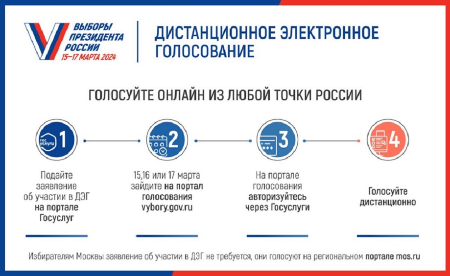 ЦИК утвердил порядок ДЭГ. Так, заявку на участие в онлайн-голосовании избирателю нужно будет подать с 29 января по 11 марта. Сделать это будет можно с помощью портала «Госуслуги». В Москве дистанционное голосование иногородних избирателей имеет свои особенности. Имея такую возможность, они за три дня до первого дня голосования должны подать соответствующее заявление с использованием механизма «Мобильный избиратель».