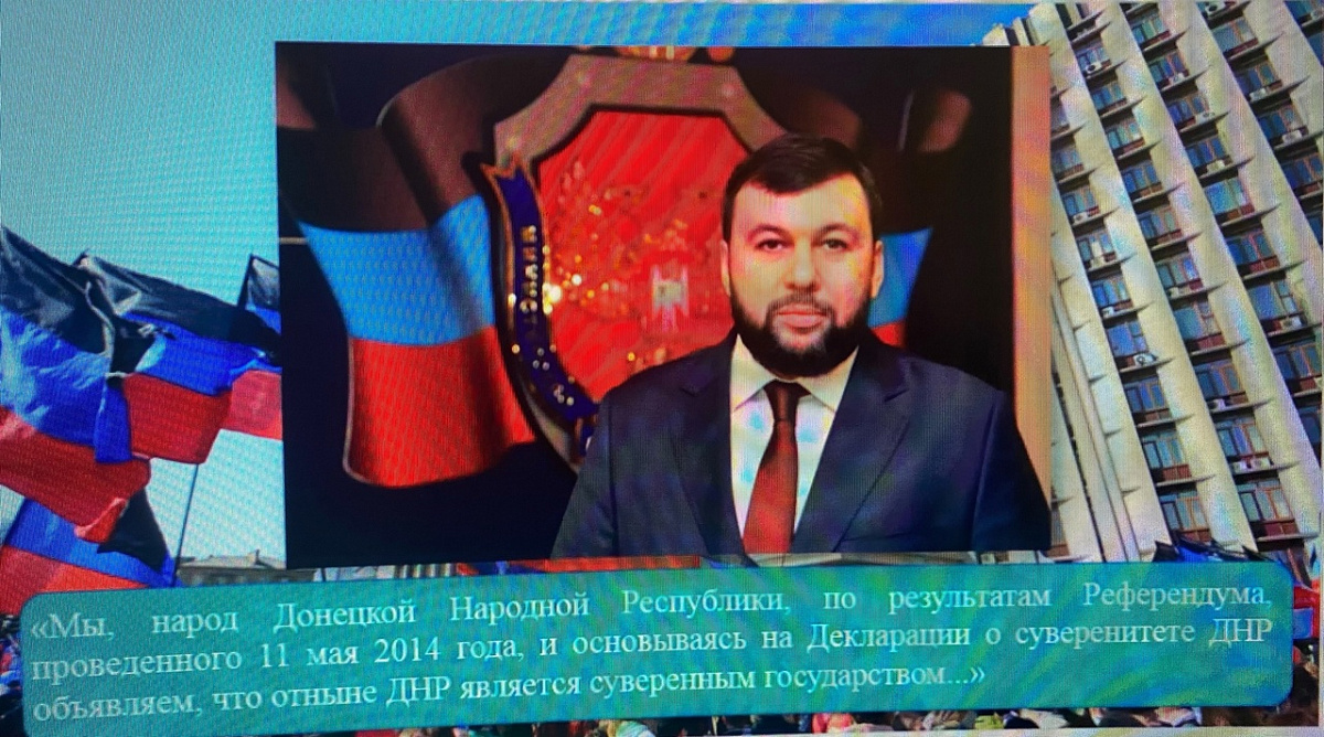 Шла речь о референдуме 11 мая 2014 года, на котором решался вопрос самоопределения Донецкой Народной Республики» и референдуме следующего дня о самоопределении Луганской Народной Республики, атрибутах ДНР и ЛНР – флагах, гимнах и гербах, и пути домой республик Донбасса – в состав Российской Федерации.