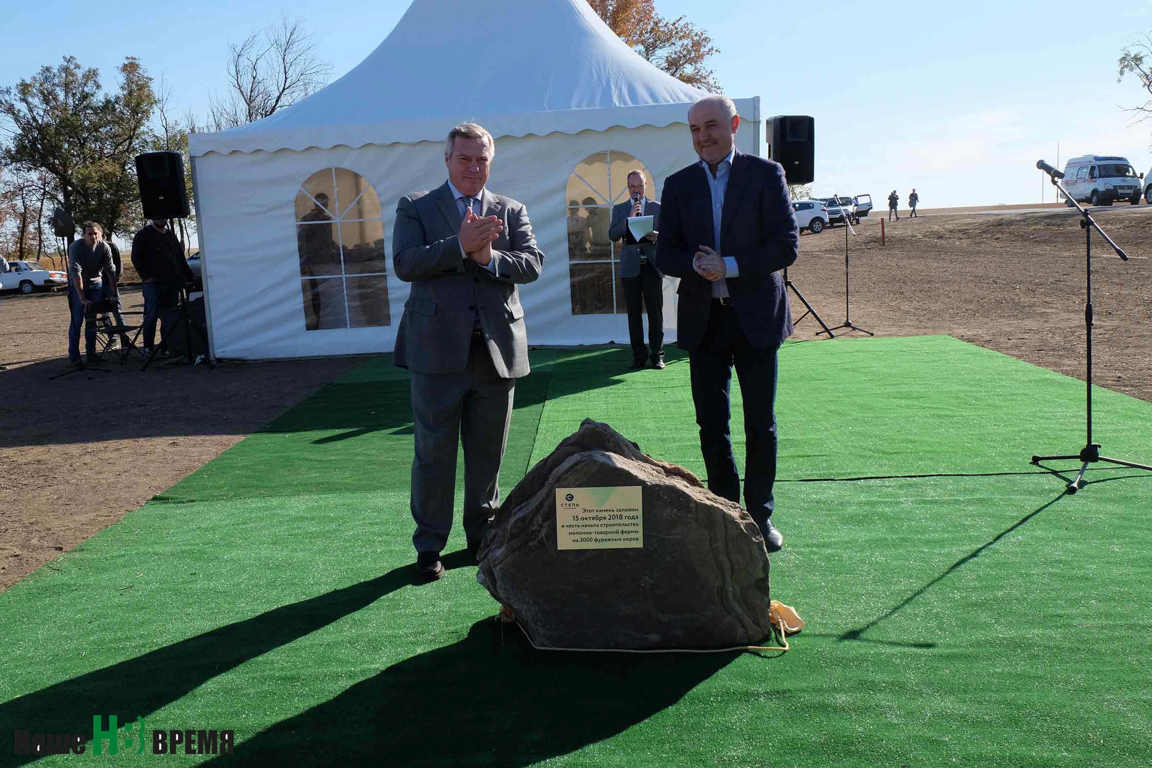 Василий ГОЛУБЕВ и председатель совета директоров агрохолдинга «Степь» Али УЗДЕНОВ на церемонии закладки первого камня молочно-товарной фермы.