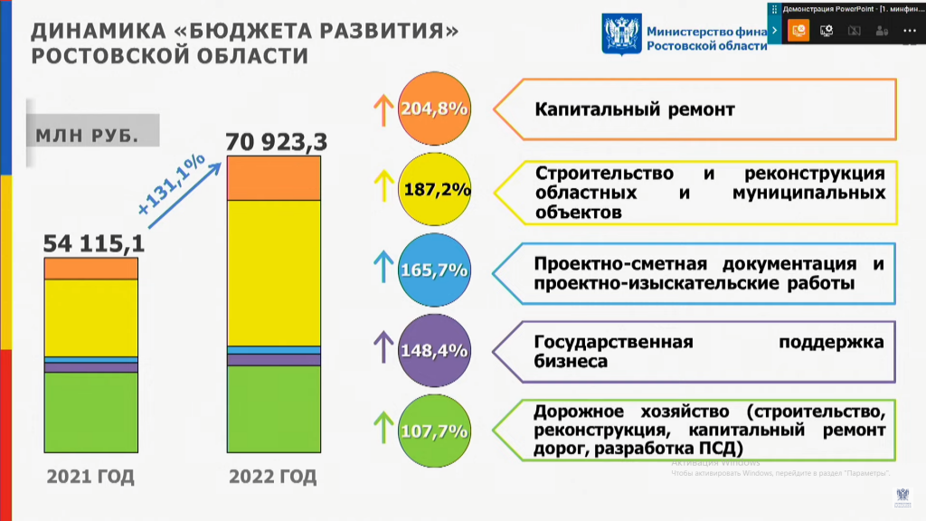 В этих условиях на Дону продолжили реализовывать крупные инфраструктурные проекты: финансирование было выделено на два объекта в рамках строительства Ростовского транспортного кольца. Это Западная хорда и Северный радиус. Деньги также пошли на создание коллектора № 62 в Ростове-на-Дону, чего требовали планы строительства новых микрорайонов донской столицы. Всего расходы на бюджет развития Ростовской области увеличились за год на 17 миллиардов рублей – на треть против прошлогоднего. Только на строительство и ремонт объектов областной и муниципальной собственности было выделено вдвое больше средств, чем годом ранее.