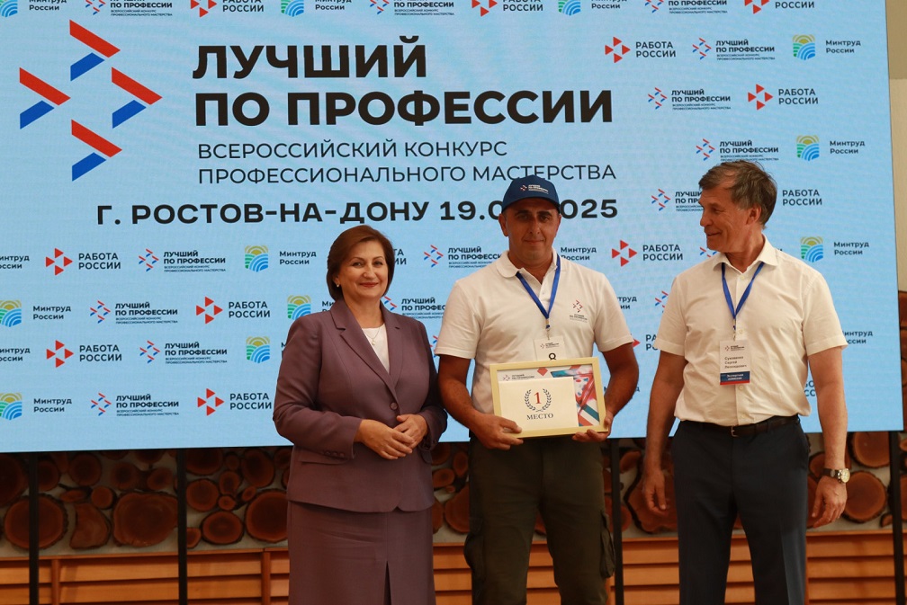 А победил и завоевал звание лучшего механизатора в сфере сельского хозяйства Андраник Хатламаджиян из колхоза имени Шаумяна Мясниковского района (на снимке – в центре). Теперь ему предстоит представлять Ростовскую область в финале Всероссийского конкурса профессионального мастерства «Лучший по профессии». Он пройдет 24-26 сентября 2025 года в Тамбовской области. На него съедутся механизаторы из всех российских регионов.