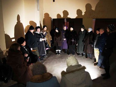 По дороге попалась старая водонапорная башня с налипшими на ней причудливыми ожерельями льда: как било из дыр водяными струями, так их морозом и схватило.