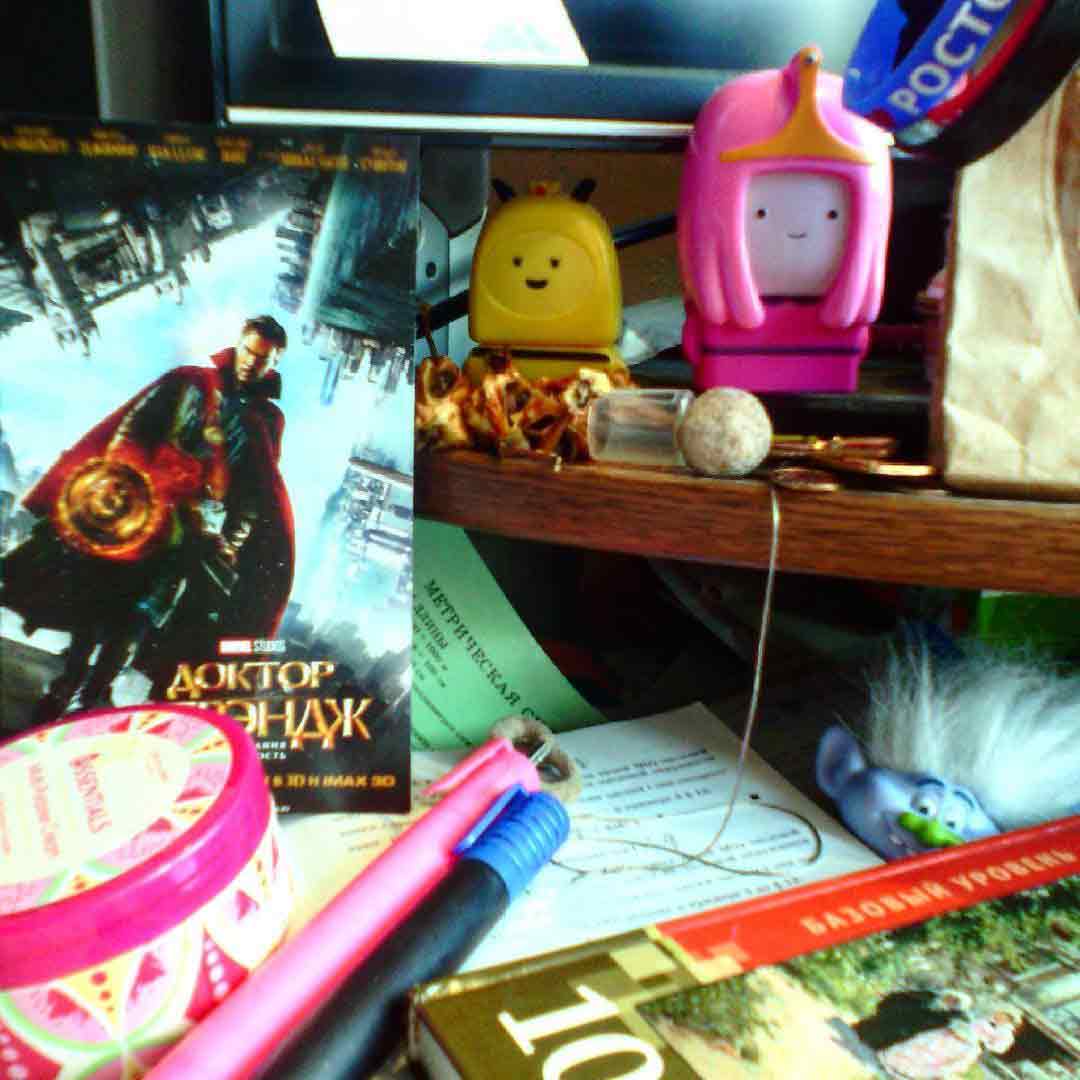 «У кого-то с утра на столе кофе и вишнёвый пирог, а у меня – такие вот красоты (смотрите фото)... Обычно моя эмоциональная оценка такой красоты зашкаливает. Чтобы не было взрыва, я стараюсь не приближаться на близкое расстояние, а то осколки могут всех больно ранить... Конечно, без кратковременных боёв не обходится, но чаще я отступаю, поскольку в ходу энштейновская фраза: «Если беспорядок на столе означает беспорядок в голове, то что же тогда означает пустой стол?». Ещё – вопрос о том, готова ли я поменять творческие, если не сказать гениальные, задатки своего ребёнка на обычные чистоту и порядок?