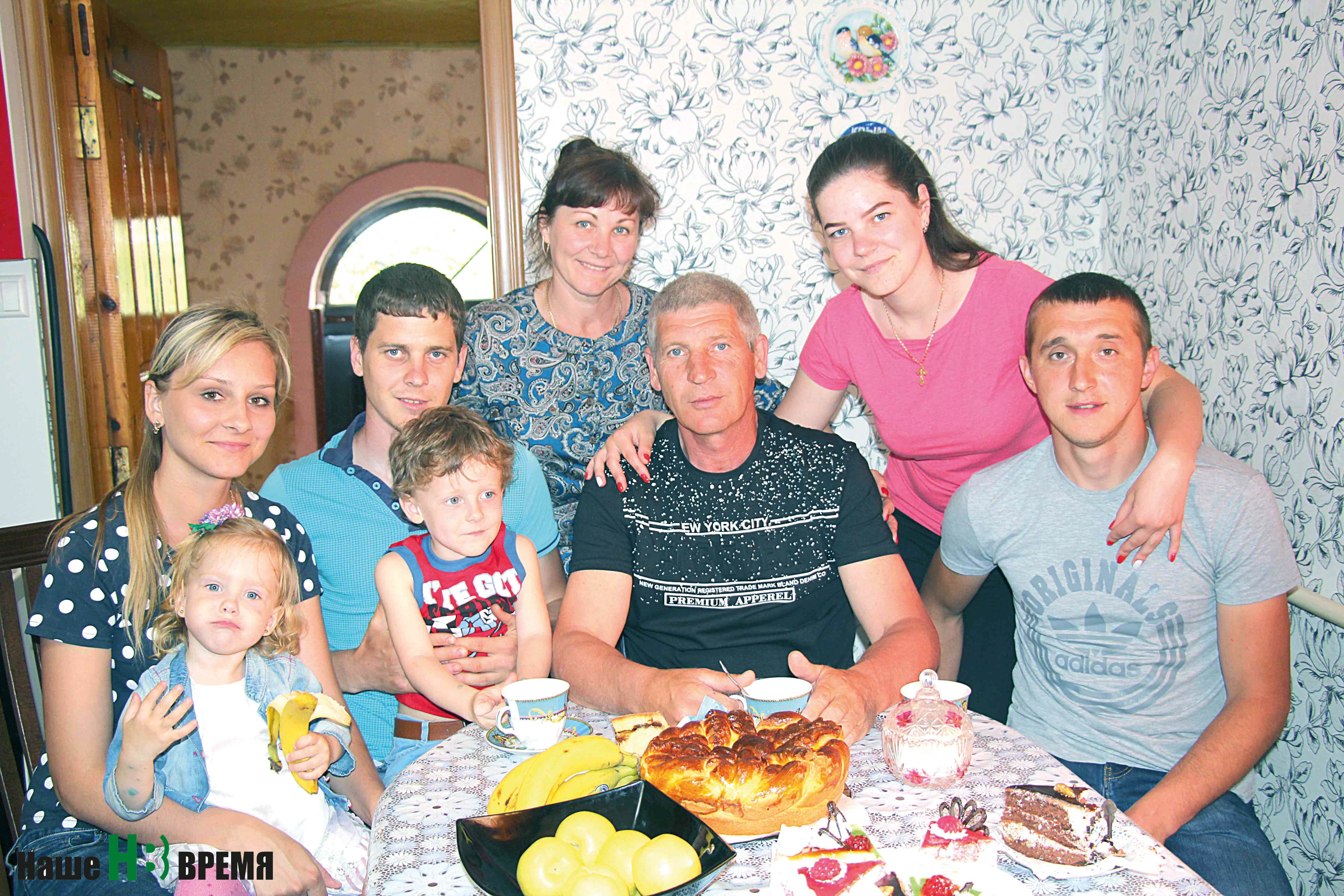 На снимке (слева направо): Анастасия с дочкой Маргаритой, Дмитрий с сыном Егором, Анна Николаевна и Александр Алексеевич, Ирина с супругом Владиславом.