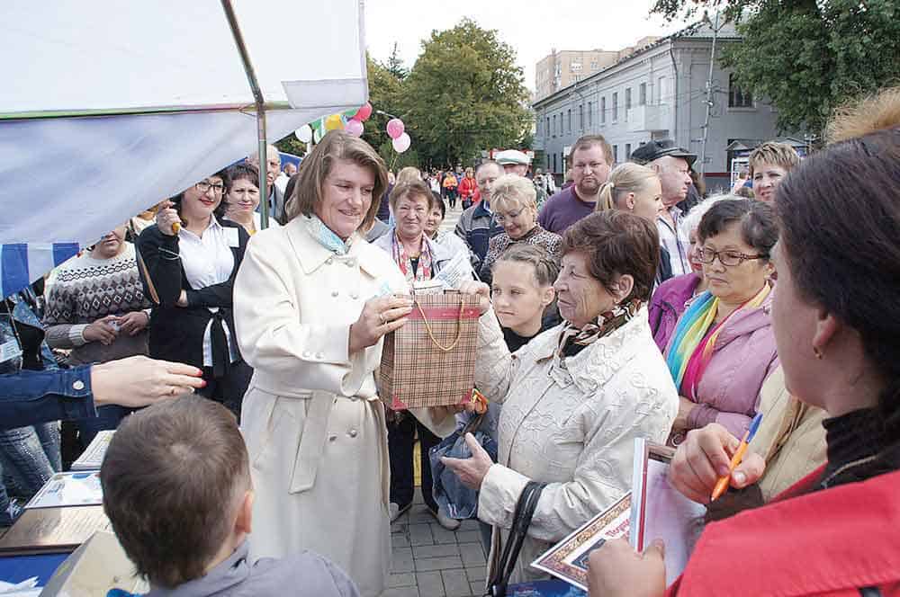 В Батайске газету «Вперед» любят. На Дне подписчика Елена ПИВОВАРОВА (в центре слева) вручает призы верным читателям.