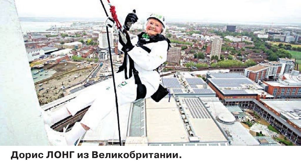 Для Дорис Лонг из Великобритании возраст не является помехой для безумных поступков. В 85 лет она неожиданно увлеклась промышленным альпинизмом. Относительно новый вид спорта называется abseling и заключается в том, чтобы умело и быстро спуститься с горы или высокого здания. В день, когда Дорис исполнилось 99 лет, она спустилась с 11-этажного дома по веревке.