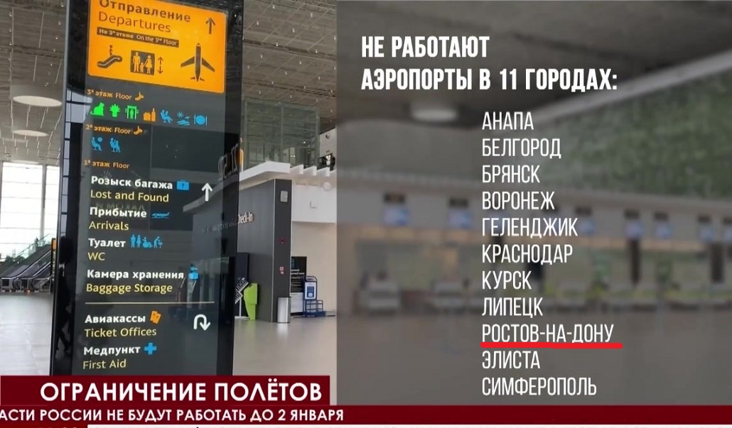 Наряду с ростовским «Платовым» тишина по-прежнему стоит в залах аэровокзалов Анапы, Белгорода, Брянска, Воронежа, Геленджика, Краснодара, Курска, Липецка, Симферополя и Элисты.