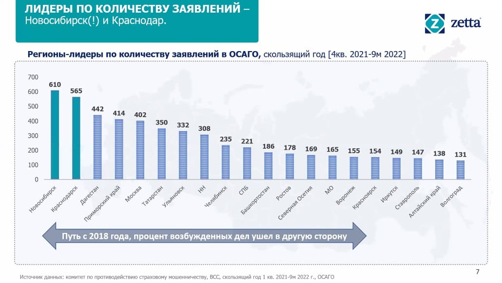 Это же наблюдалось еще пару лет назад на соседней с нами Кубани. Сейчас же, после долгих совещаний и совместных мероприятий страховых компаний и администрации региона, ситуация принципиально изменилась — Краснодарский край перешел из «красной» в «желтую зону» риска подобных мошенничеств. Аналогичная ситуация еще раньше произошла и в Ростовской области: если относительно недавно донской регион страховщики называли одним из наиболее «токсичных», то сейчас Ростов лишь на 12 месте по количеству поданных в полицию заявлений о мошенничестве. Снижение криминальной составляющей в страховом деле донские автовладельцы ощутили по уменьшению коэффициента при оформлении ОСАГО и общему снижению количества подстроенных ДТП — мошеннические схемы уже известны и легко оспариваются страховщиками в судах.