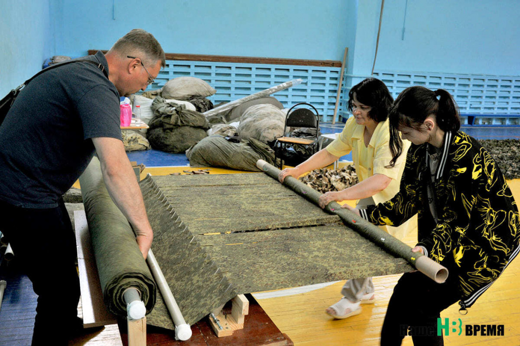 Рядом на ленты начали распускать ткань: рулон ткани камуфляжной расцветки, закрепленный на импровизированном станке, протянули до конца школьного спортзала. Станок сделан из основы старой кровати, на которой смонтировано крепление для рулона и доска с лезвиями от канцелярских ножей — ткань разрезается на ровные полосы. Теперь эти многометровые ленты нужно нарезать на куски, смешать с такими же отрезками других цветов и приступить к созданию пестрого полотна, которое сверху ни цифровой объектив, ни глаз оператора БПЛА не отличит от участка леса или степи.