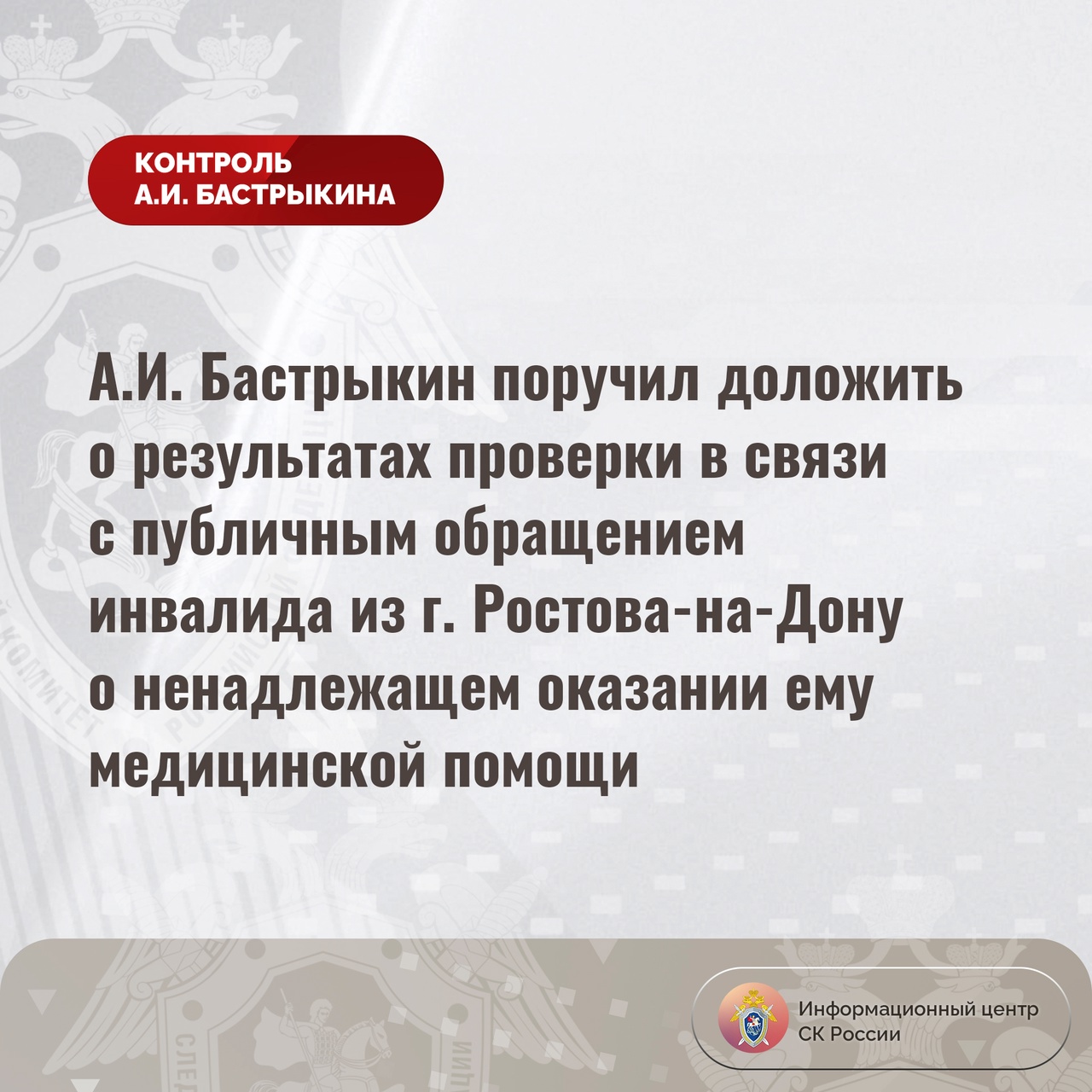 В информационном центре Следственного комитета России сообщили о том, что руководитель ведомства Александр Бастрыкин поручил руководителю СУ СК России по Ростовской области Аслану Хуаде доложить о результатах проверки в связи с публичным обращением инвалида из донской столицы о ненадлежащем оказании ему медицинской помощи.