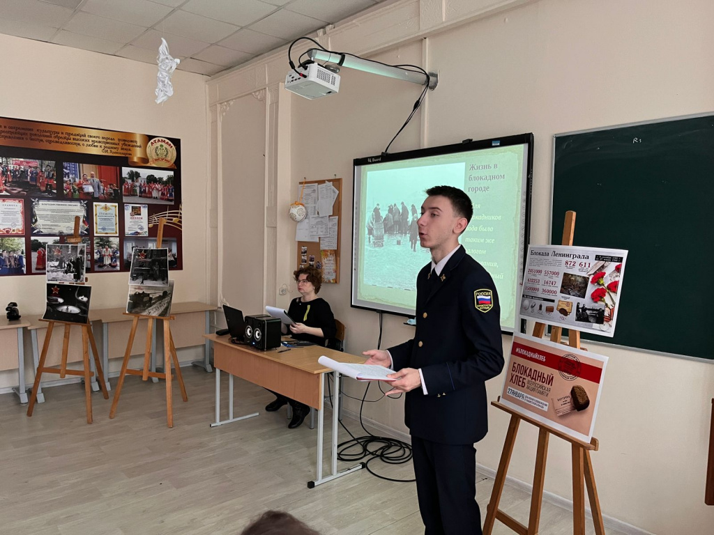 Собравшиеся на уроке памяти «Блокадный метроном» увидели фильм, посвященный защитникам Ленинграда. Мелькали кадры – днем фашисты обстреливали город из дальнобойных орудий, ночью сбрасывали с самолетов зажигательные и фугасные бомбы. Рушились жилые здания, школы, детские дома, больницы. На домах появились предупреждающие надписи: «Граждане! Во время обстрела эта сторона улицы наиболее опасна!».