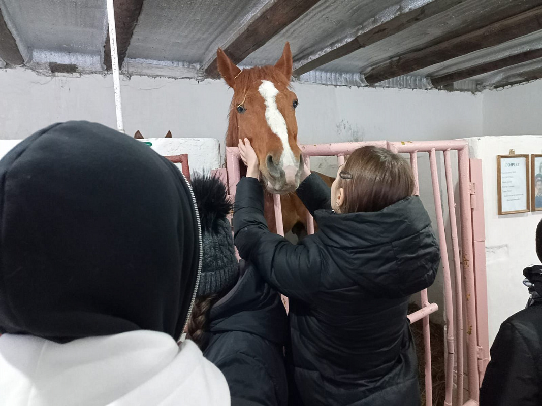 Далее учащиеся прошли в конюшню, где в денниках стояли лошади. Ребята узнали об особенностях ухода за ним, о различиях в мастях и породах и даже о строении лошади.