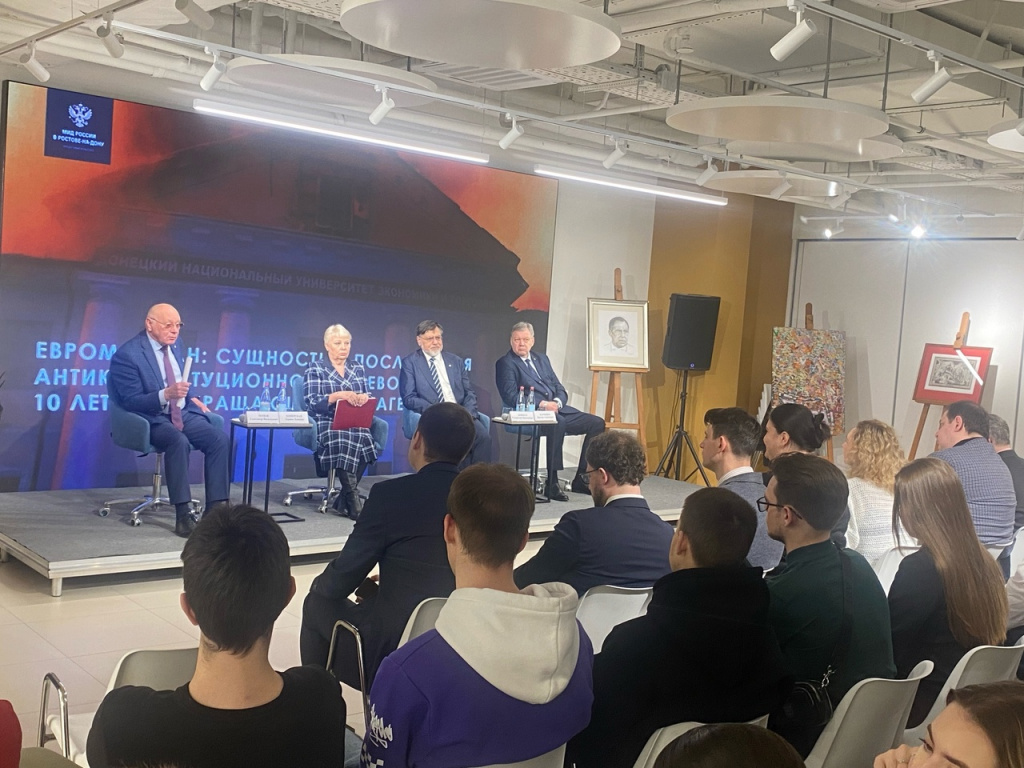 Речь идет об открытии 21 марта в Ростовском центре истинных ценностей выставки «Евромайдан: сущность и последствия антиконституционного переворота 2013–2014 годов на Украине» и панельной дискуссии. В ней приняли участие недавно назначенный главой территориального представительства МИД России в Луганске Владислав Дейнего, доктор политических наук и профессор Лариса Хоперская и волонтер гуманитарной миссии Никита Слинько.