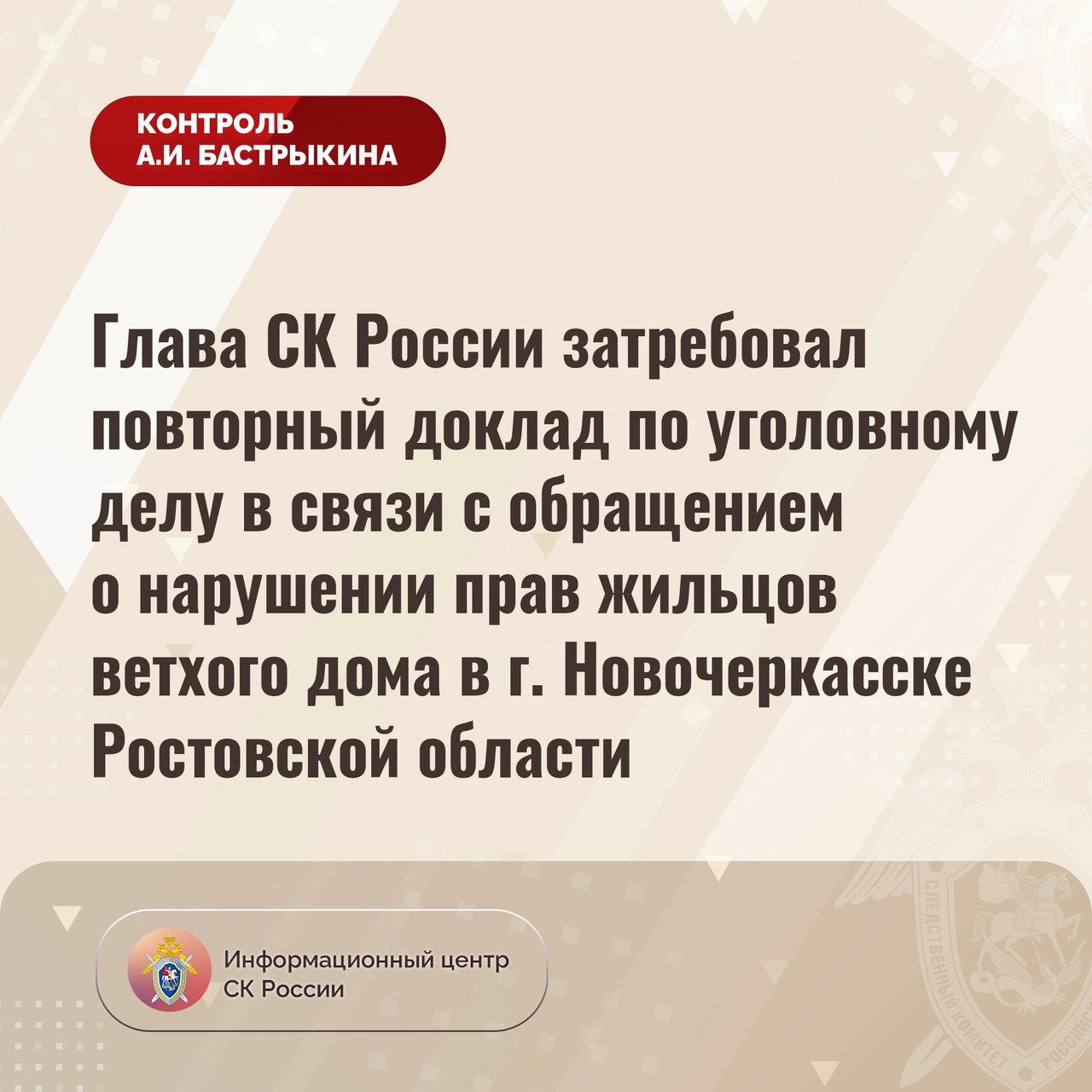 Александр Бастрыкин затребовал повторный доклад по уголовному делу, касающемуся жильцов ветхого дома из Новочеркасска.