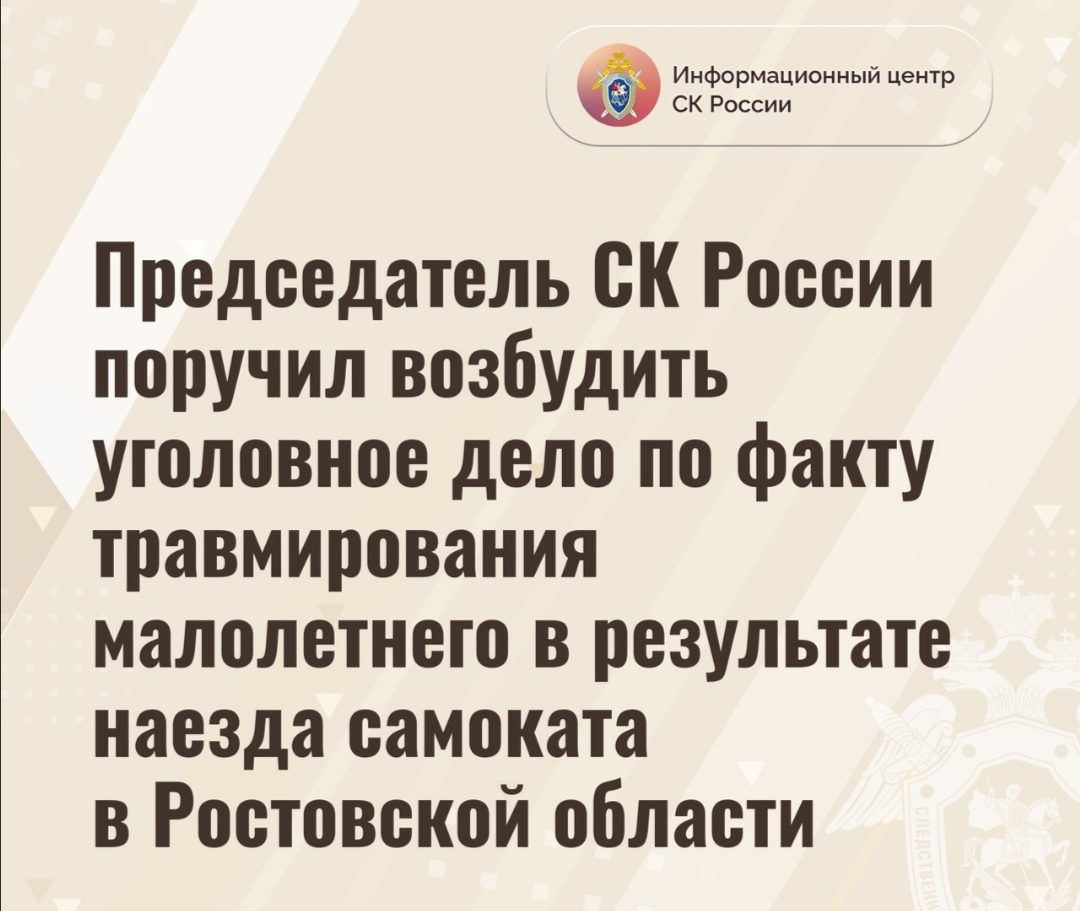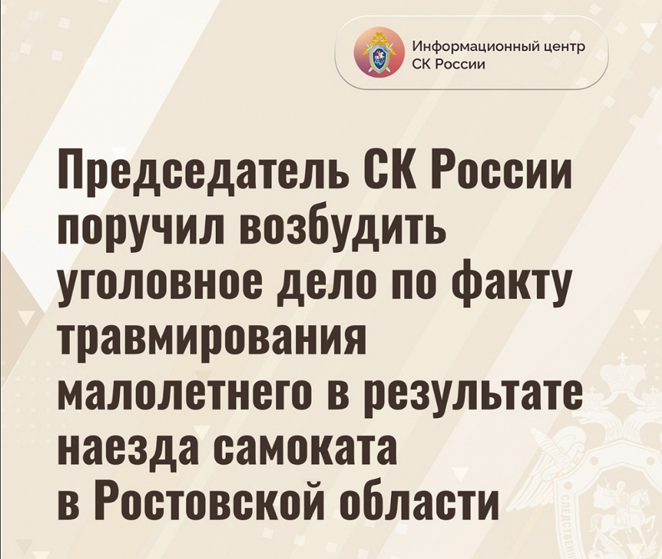 В информационном центре СК России сообщили о том, что глава ведомства Александр Бастрыкин поручил возбудить уголовное дело по факту травмирования в Ростовской области малолетнего в результате наезда самоката.
