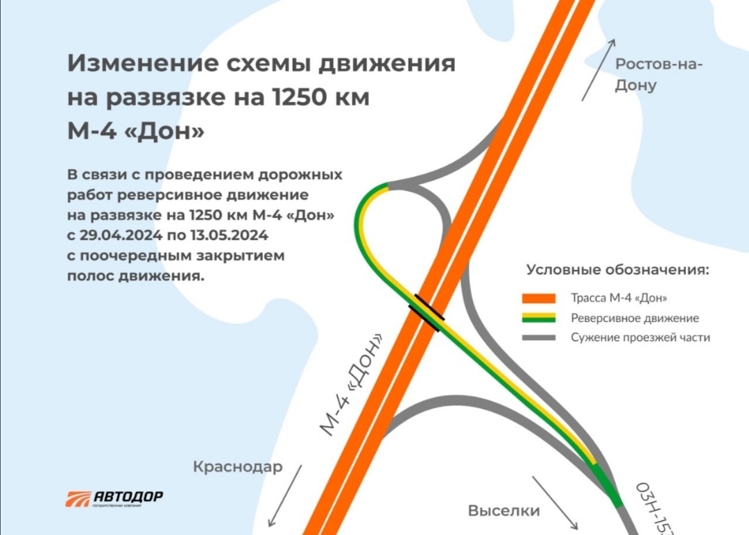 Кроме того, для проведения дорожных работ с конца апреля по 13 мая на развязке на 1250 км М-4 «Дон» установлено временное ограничение скоростного режима, а также реверсивное движение.