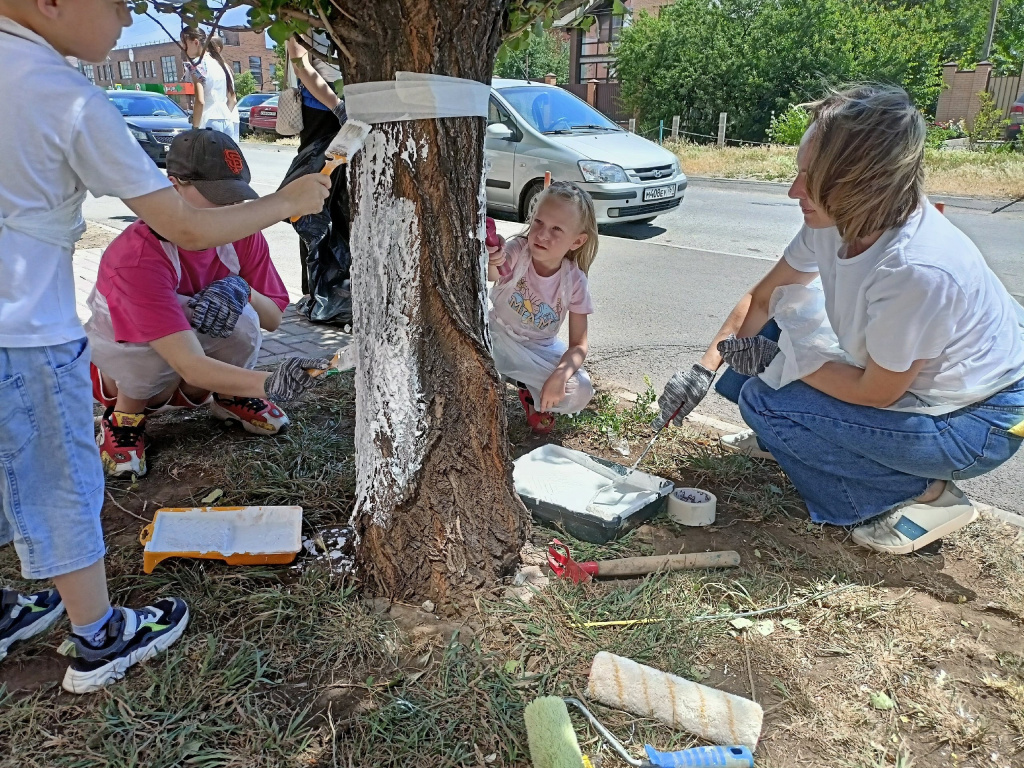 Волонтеры устроили для малышей и подростков розыгрыши, конкурсы, провели субботник. Дети с помощью родителей и добровольцев побелили деревья и привели в порядок двор центра.