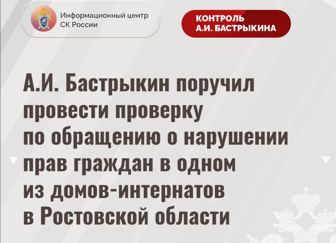 В информационном центре СК сообщили о том, что в приемную председателя СК А. И. Бастрыкина «ВКонтакте» поступило обращение о совершении противоправных действий в отношении граждан, проживающих в одном из домов-интернатов для престарелых и инвалидов в Ростовской области.