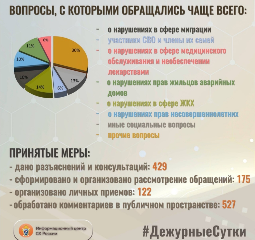 Люди сигнализируют о нарушениях в сфере миграции, медицинского обслуживания и обеспечения лекарствами, несоблюдении прав жильцов аварийных домов, других нарушениях в сфере ЖКХ, а также о нарушениях прав несовершеннолетних.