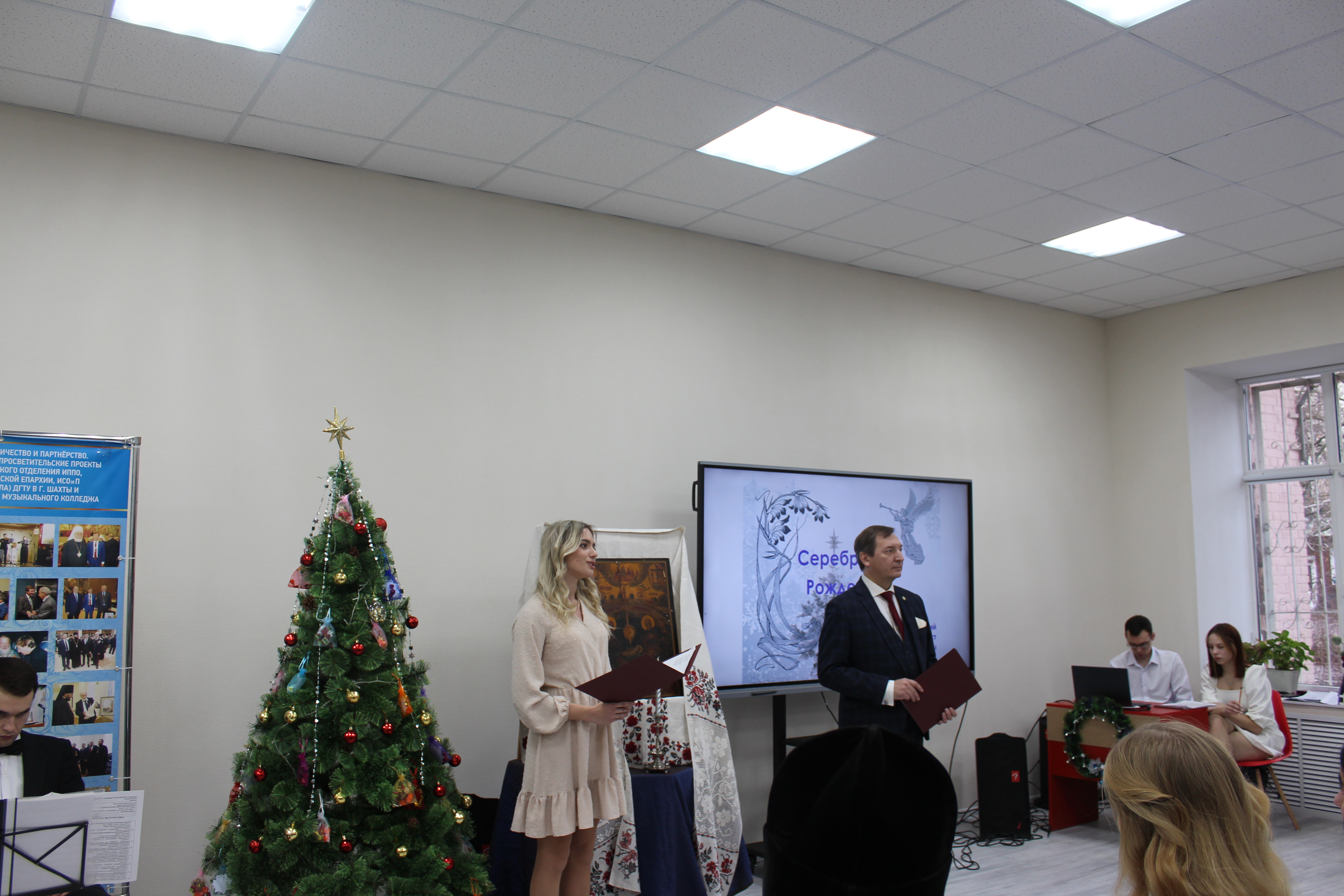 Классические рождественские музыкальные произведения исполнил струнный квартет преподавателей и студентов Шахтинского музыкального колледжа: Арина Желтушкина (1 скрипка), Яна Витальевна Воротникова (2 скрипка), Юлия Юрьевна Коваленко (альт), Аркадий Передереев (виолончель). Старинный русский романс «В лунном сиянии снег серебрится» исполнила студентка Владлена Назарова. Стихотворение Максимилиана Волошина «Хвала Богоматери» прочла студентка Анна Демидова.