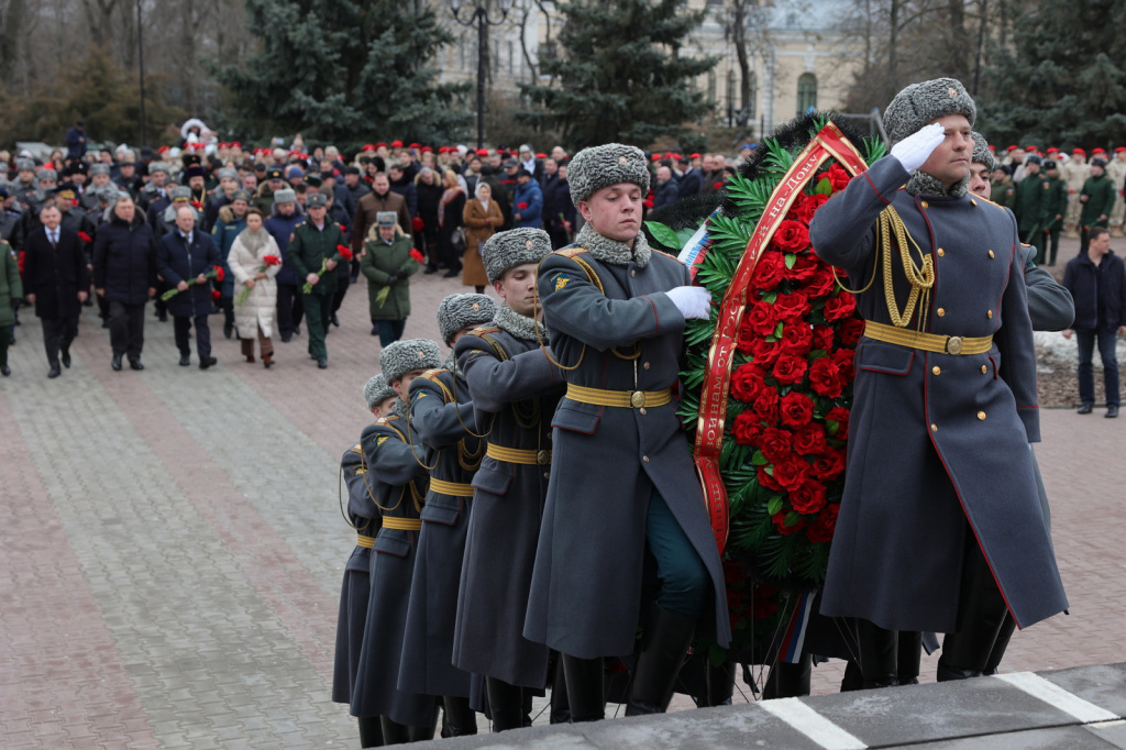 В честь Дня защитника Отечества власти области возложили гирлянду Славы к мемориалу павшим воинам. После Минуты молчания рота почетного караула прошла торжественным маршем.