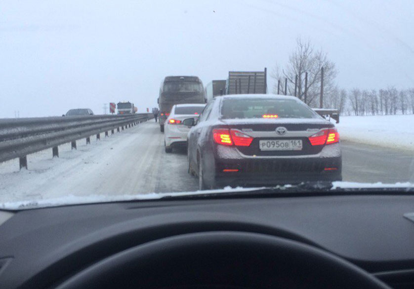 Хронические многокилометровые заторы начались на трассе М4-Дон. Под Шахтами дорожники начали ремонт, движение сильно затруднено.