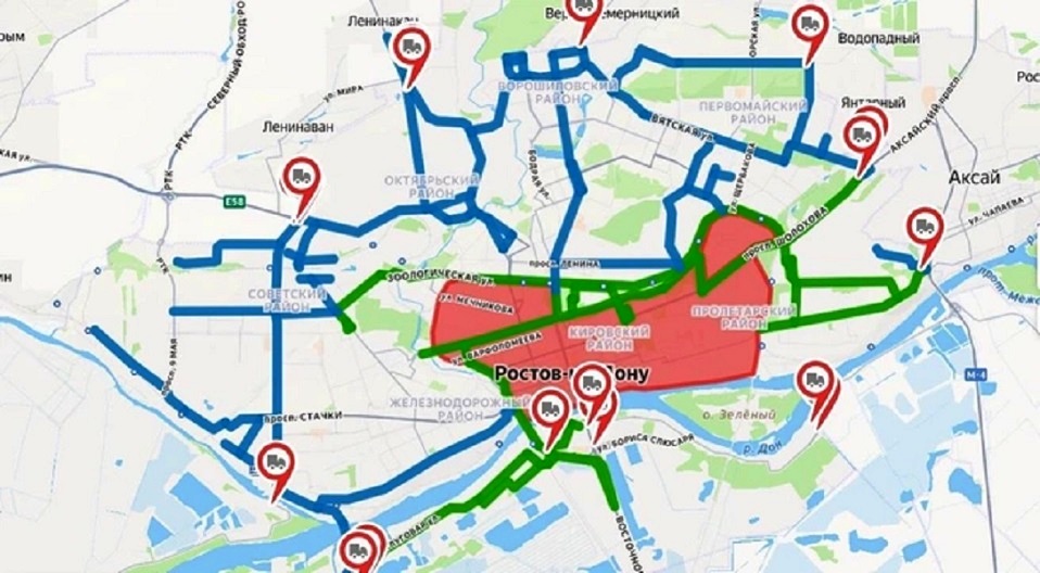 Грузовой каркас Ростова. Зеленым отмечены участки улиц грузового каркаса, реализованных в 2024 году, синим — планируемые участки улиц грузового каркаса, движение грузовых автомобилей не запрещено, красным — зона запрета транзитного движения. Источник: «Ян