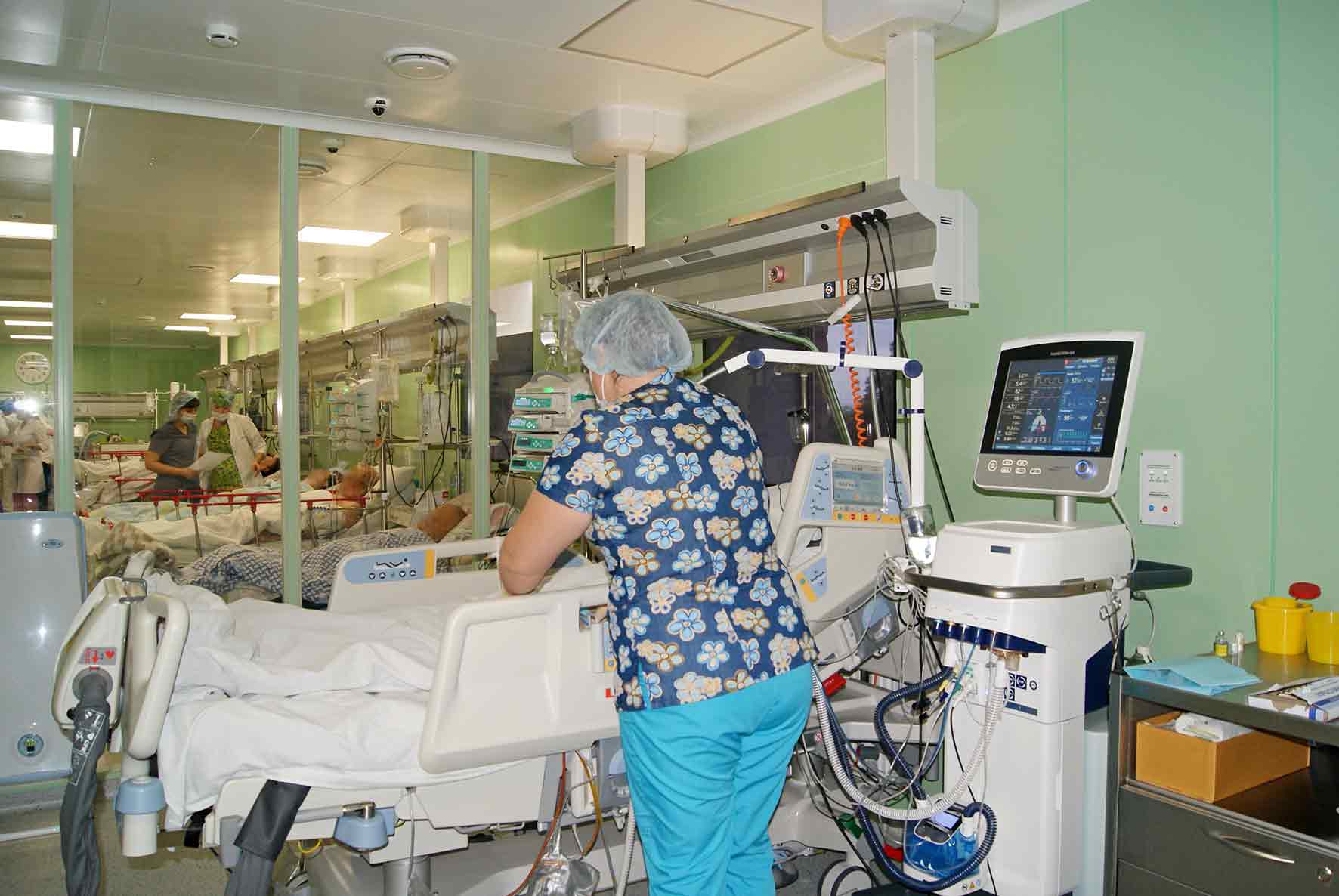 Реанимацию разделили на чистую зону и зону общего пользования, оборудовали отдельный септический блок. Есть шлюзы с автоматическими дверями, запущена система вентиляции с забором отработанного воздуха и подачей в палаты интенсивной терапии стерильного кондиционированного воздуха.