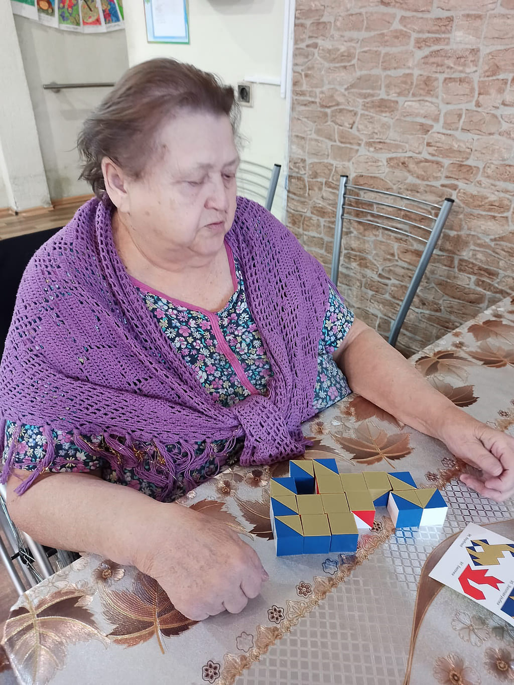 Многие упражнения похожи на детские развивающие занятия. Но в случае с пожилыми людьми это занятия, сохраняющие память, мышление. В последнее время специалисты дома-интерната в работе со своими подопечными стали применять такую технологию, как арт-терапия с использованием раскрасок.