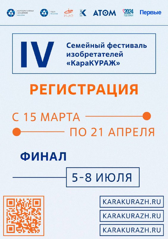 Корпорация «Росатом» уже четвертый раз проводит семейный фестиваль изобретателей-рационалистов «КараКУРАЖ». До окончания регистрации участников нынешнего фестиваля остается немного времени – успейте заполнить анкету на сайте karakurazh.ru к 21 апреля.