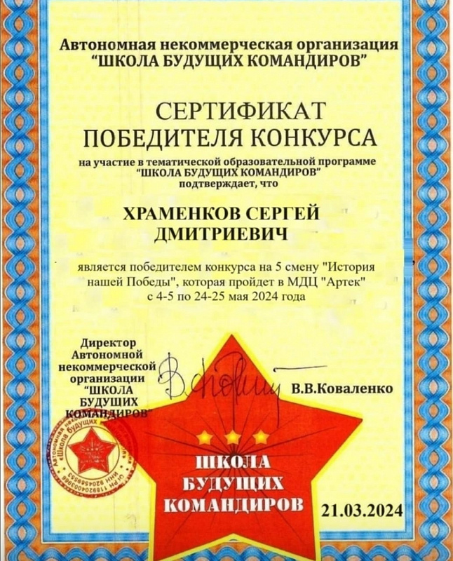 В международном детском центре «Артек» открылась тематическая образовательная программа «Школа будущих командиров». Юнармию Ростовской области здесь представляет Сергей Храменков (отряд «Росичъ» школы № 16 г. Ростова-на-Дону).