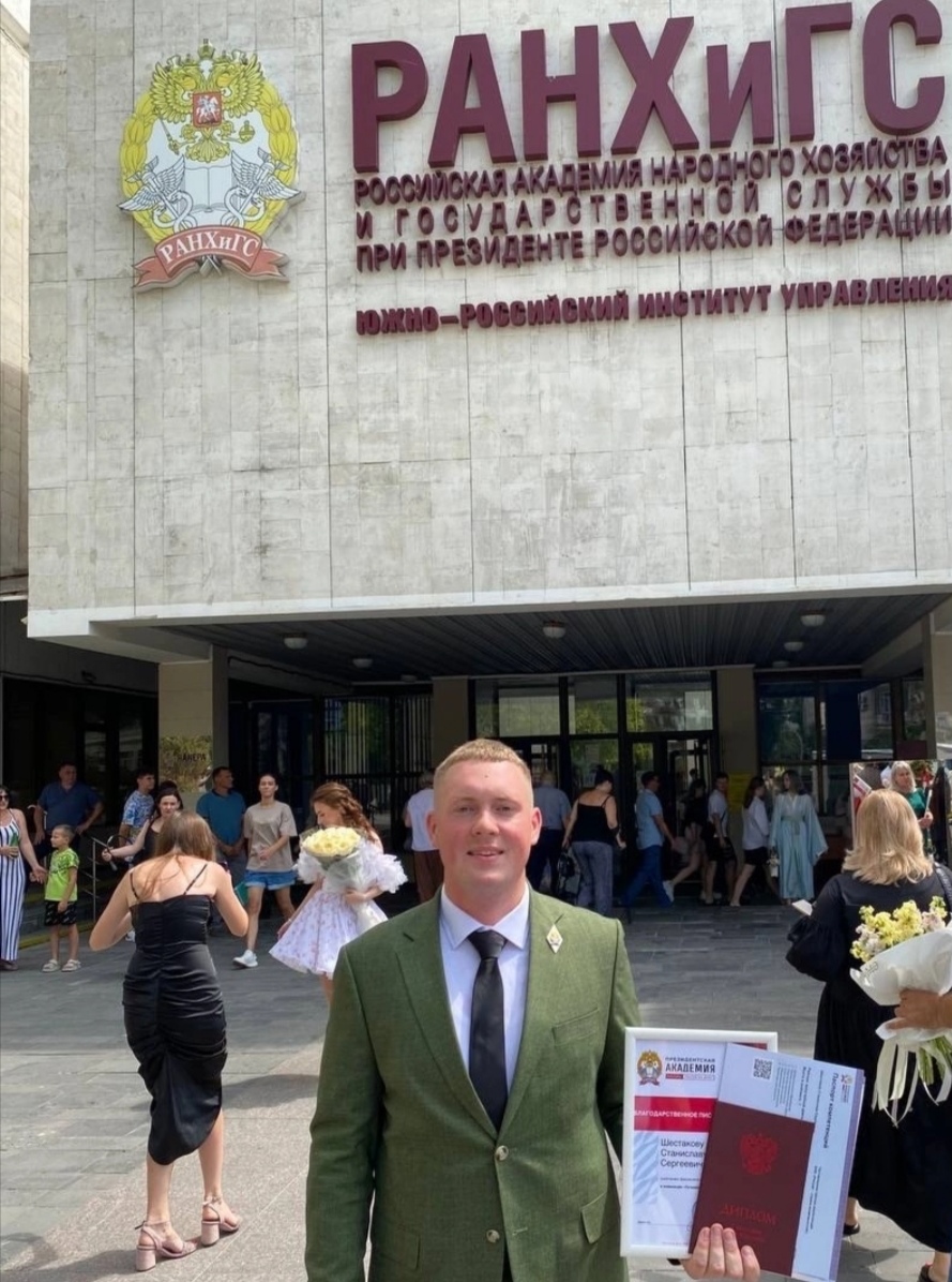 Участник донских поисковых сообществ «Красный комиссар» и «Миус-фронт» (Зерноградский филиал) Станислав Шестаков, ранее удостоенный благодарственного письма донского губернатора Василия Голубева, побеждавший в федеральном конкурсе «Студент года РАНХиГС», принимает теперь поздравления с успешным окончанием Президентской Академии.