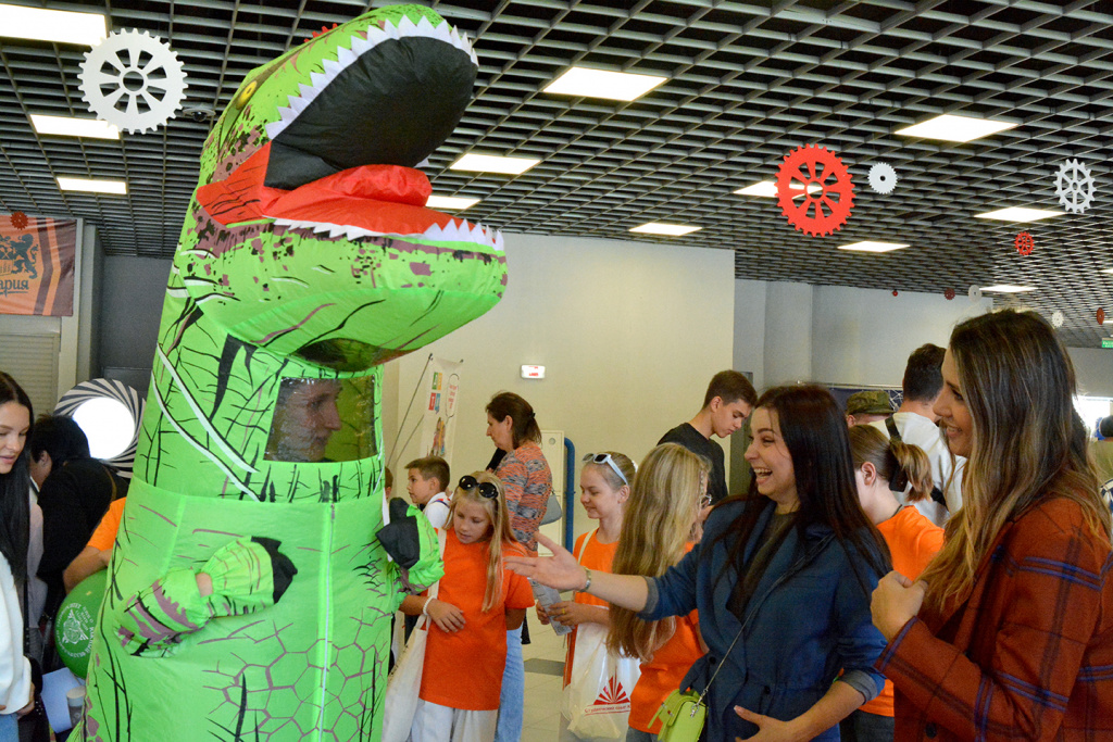 Многие гости фестиваля с удовольствием пожимали лапу динозавру и фотографировались с ним