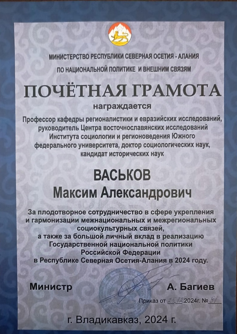 Профессор кафедры регионалистики и евразийских исследований, руководитель Центра восточнославянских исследований Института социологии и регионоведения Южного федерального университета Максим Васьков был награждён почётной грамотой Министерства Республики Северная Осетия-Алания по национальной политике и внешним связям.