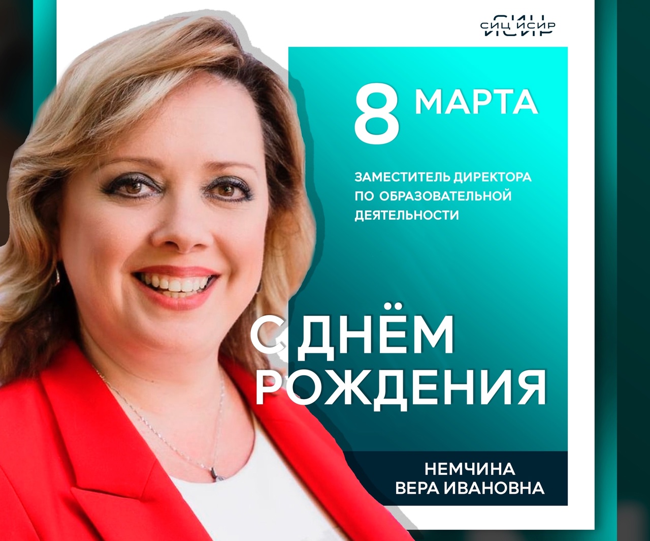 - Сегодня мы от всей души хотим поздравить с днем рождения нашего дорогого и уважаемого заместителя директора по образовательной деятельности Немчину Веру Ивановну! Вера Ивановна, ваша работа очень важна для нас! Спасибо за вашу преданность и профессионализм, мы очень ценим ваши усилия и труды. Пусть этот день будет наполнен радостью, улыбками и теплыми поздравлениями от близких и родных. Желаем Вам исполнения всех желаний и мечт! С днем Рождения !