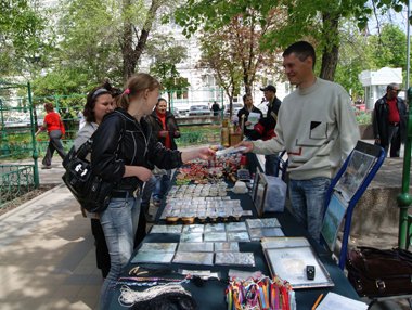 Алексей продает в парке Горького фенечки, магниты, четки. Все сделано своими руками. В прошлом году на выкладке у него появился еще и фильм о Ростове «Жемчужина юга России». Фильм он делал долго. Сам снимал, текст составлял, монтировал. Говорит, все делал самостоятельно, потому что хотел отразить собственное виденье, ощущения.