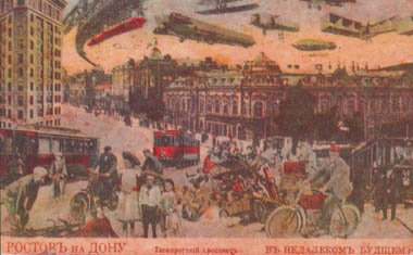 В начале XX века в Ростове выпустили серию открыток с видами города, его достопримечательностей, сценами из жизни ростовцев. Одно из изображений заметно отличалось от прочих. Это — футуристический коллаж «В недалеком будущем». Его автор, чье имя история для потомков не сохранила, нафантазировал Таганрогский (ныне — Буденновский) проспект завтрашнего дня.