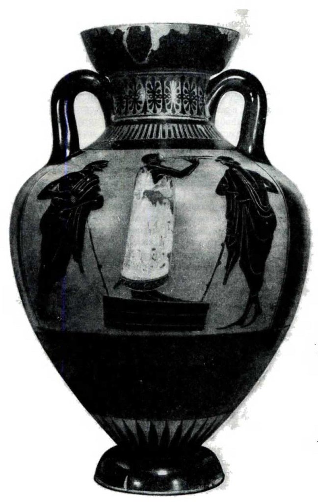 Панафинейская амфора из раскопок Елизаветовского городища как раз вручена была победителю-музыканту. На оборотной стороне сосуда изображены три фигуры: в центре – кифаред в лавровом венке, он входит на трехступенчатые подмостки. Слева судья в длинной одежде с палкой в руке, справа юноша в венке и рядом каноническая надпись: «награда из Афин». В общем классика V в. до н.э.