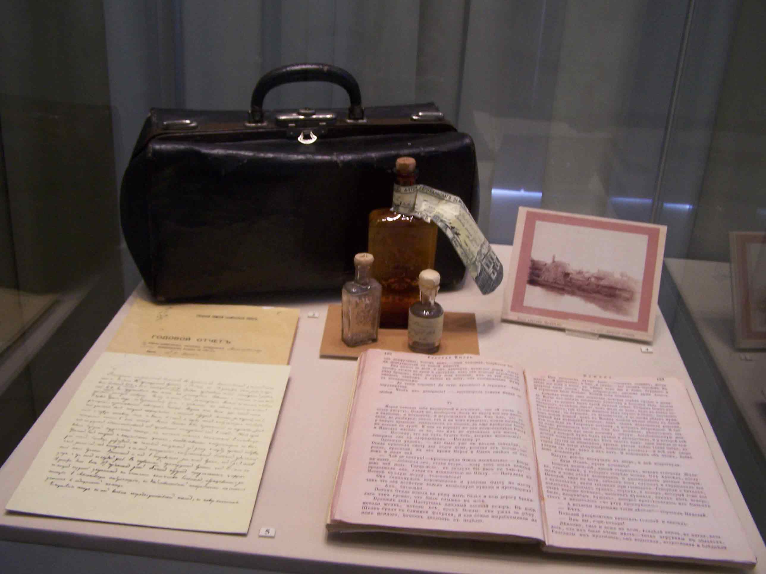 Среди экспонатов – отчет Чехова Серпуховскому земству о том, какие меры предпринял он на случай холеры, как ведет профилактическую работу. К счастью, эта страшная зараза Мелихово обошла стороной, но Чехов, не будучи официально земским доктором, делал все, что должен во время эпидемии холеры предпринимать земский врач.