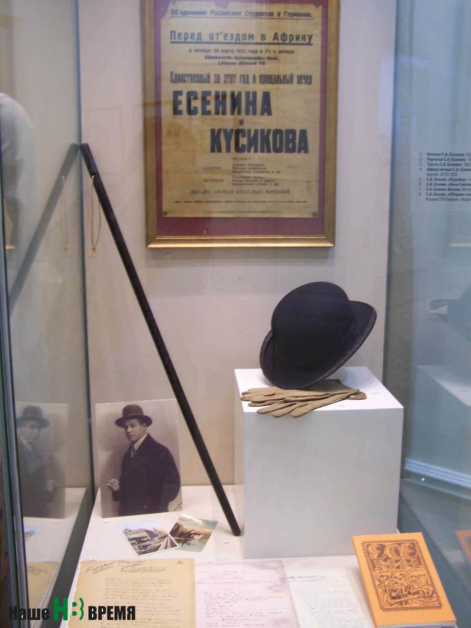 – Вот – дорогие нашему сердцу мемории, – говорит сотрудник Есенинского музея-заповедника Валерия Евдокимова, останавливаясь у витрины, за которой перчатки, котелок, шарф Есенина. В соседней – испанский концертный бубен Айседоры Дункан с изображением корриды.