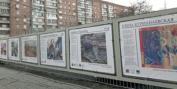 «Взрослый» арт-уголок обустроен по тому же принципу, что и детские вернисажи под открытым небом. Кстати, это действительно угол. Арт-площадка стала частью ограждения стройплощадки в самом центре донской столицы: на пересечении Ворошиловского проспекта с улицей имени Максима Горького. Здесь репродукции работ ростовских художников – живописцев и графиков.