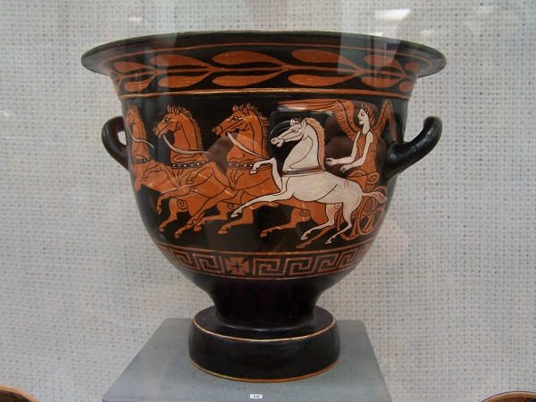 Пока исследователи смогли восстановить сюжет древней росписи лишь на одной стороне кратера. Это богиня Ника, управляющая квадригой (четверкой упряжных лошадей).