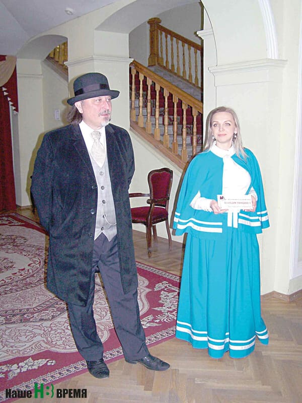 И вот заходим с группой экскурсантов в театральное фойе, а там нас ожидают импозантный господин средних лет и его молодая спутница. Оба одеты по моде того времени, когда в этих стенах еще гимназистом бывал будущий великий писатель Антон Павлович Чехов.